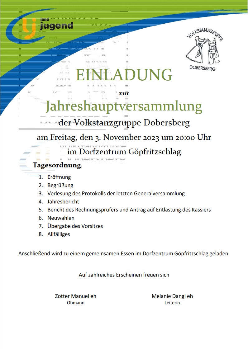 Jahreshauptversammlung am FR 03.11.2023 im DZ Göpfritzschlag: